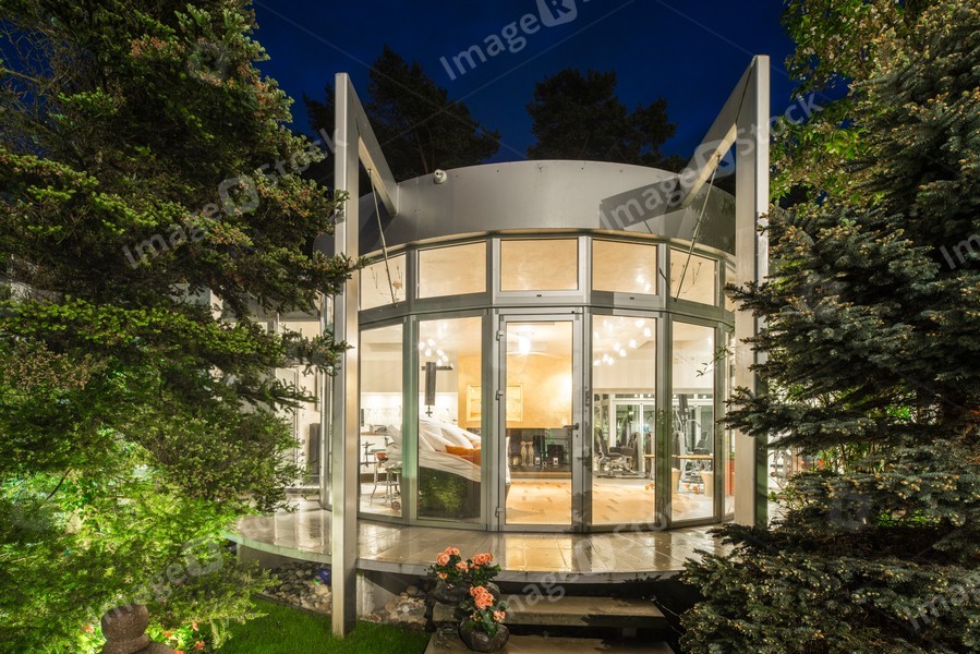 Modern exterior of luxury private house at twilight. Beautiful garden.
