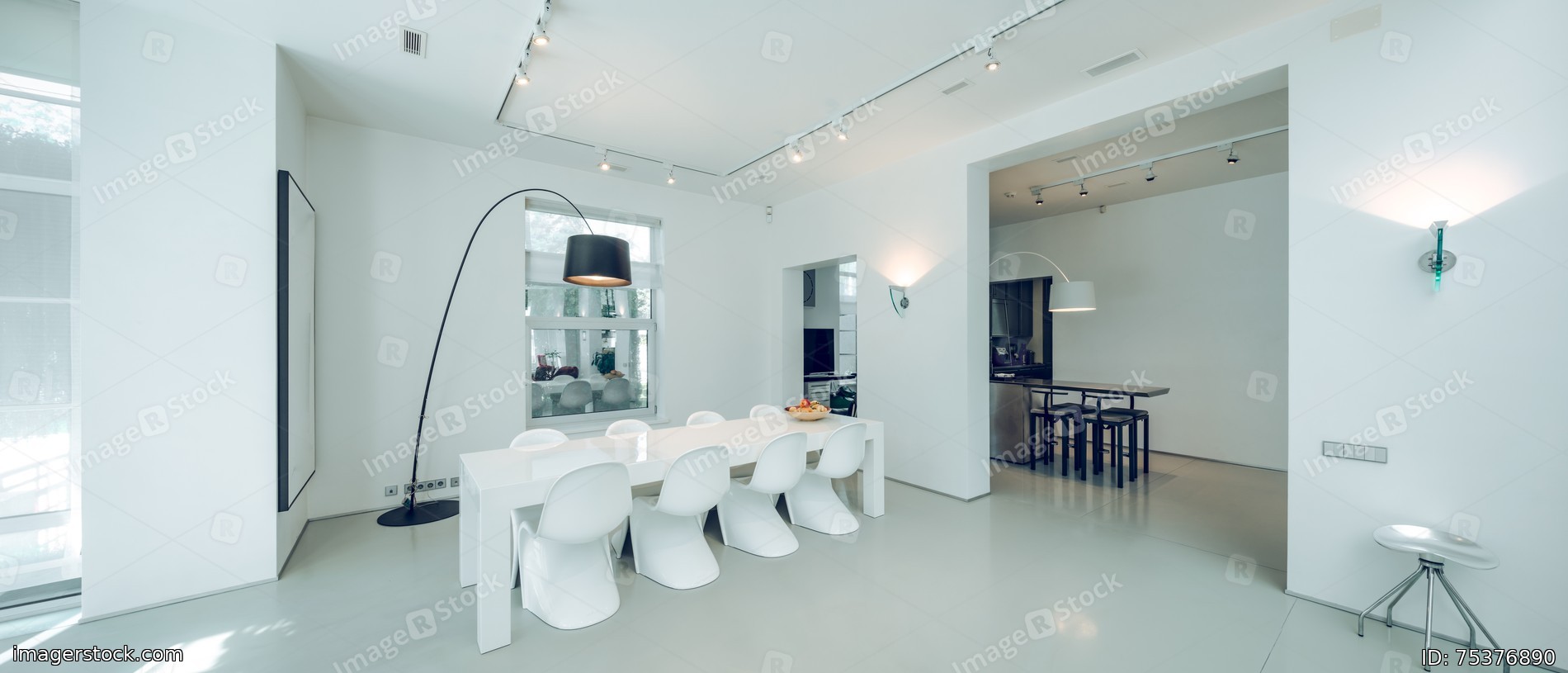 Modern interior of spacious living room. White dinner table and chairs