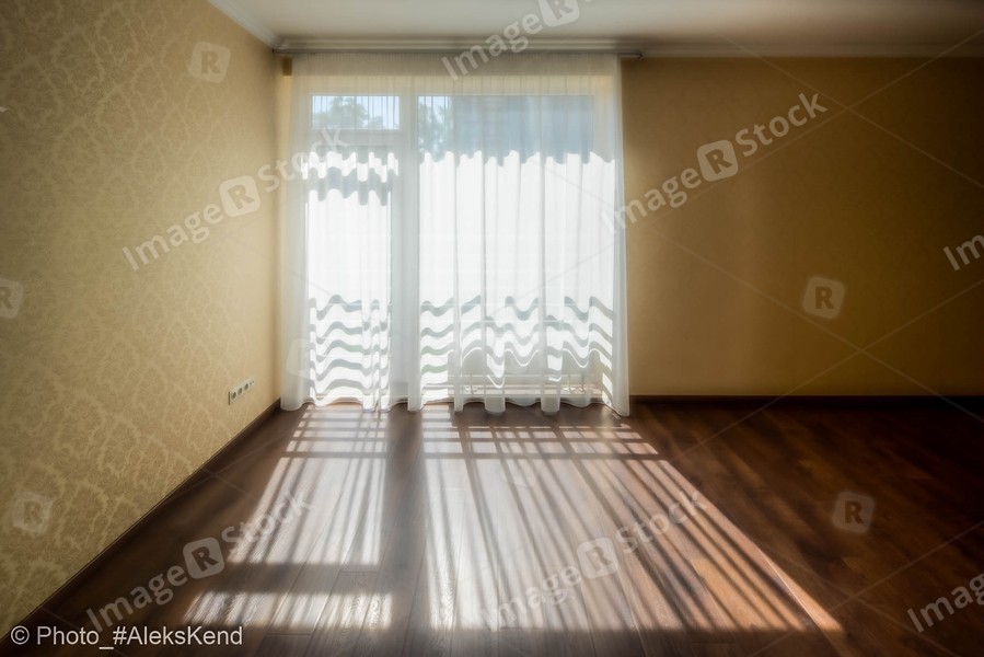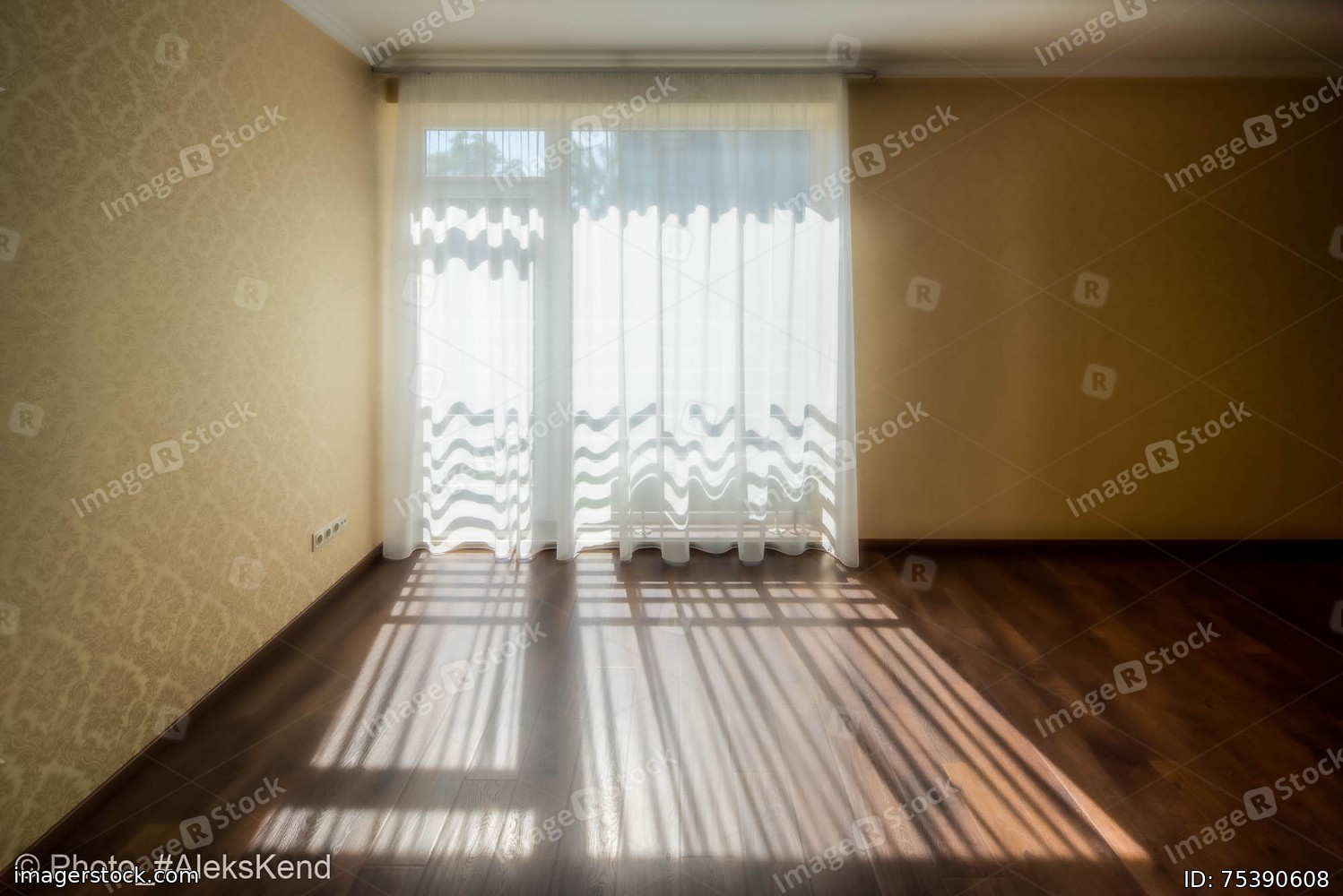 Contemporary interior of spacious living room in brown tones. White tulle. Sunlight.