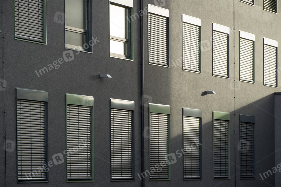 Wall of office building with closed windows. Modern exterior.