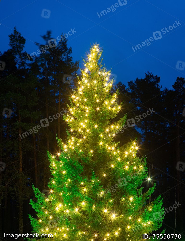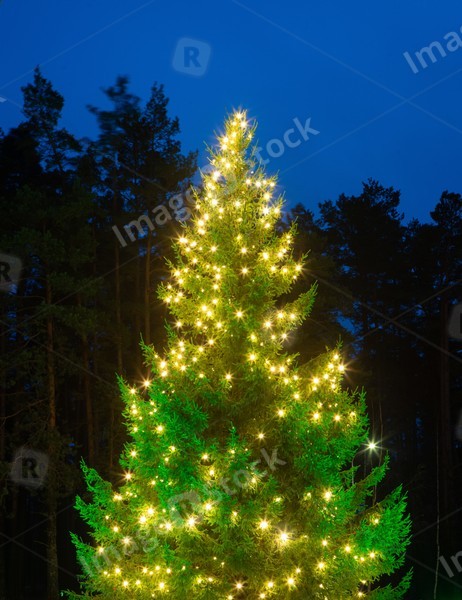 Beutiful illuminated Christmas tree outdoors. Winter holidays