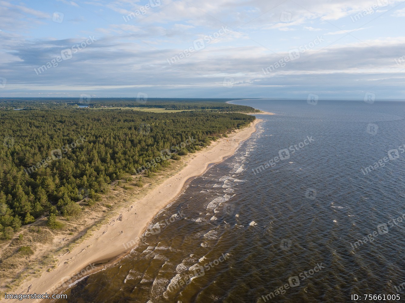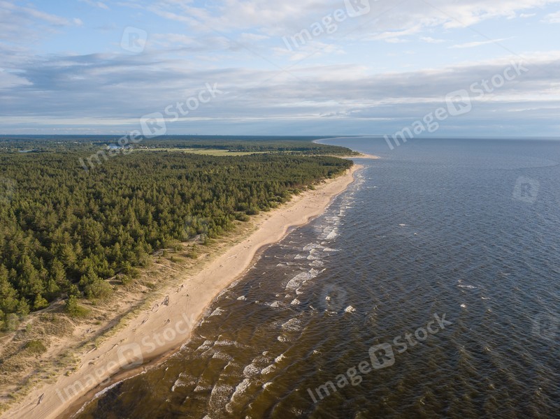 Beach on the sea, top view. Aero photographing a sea beach at sunset.