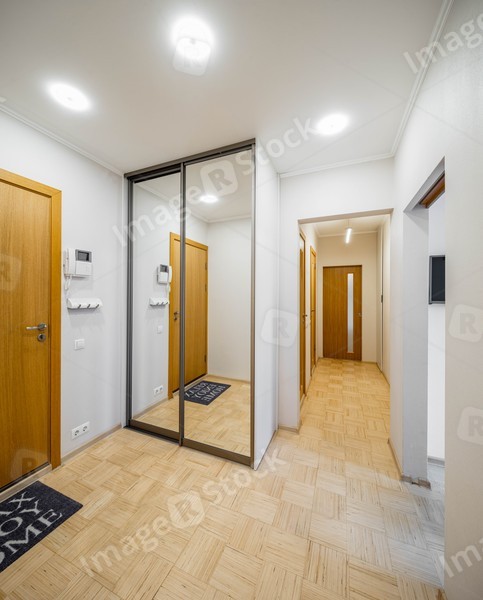 Modern interior of entrance hall in luxury apartment. Wooden door. Sliding door wardrobe with mirror. Narrow hallway.