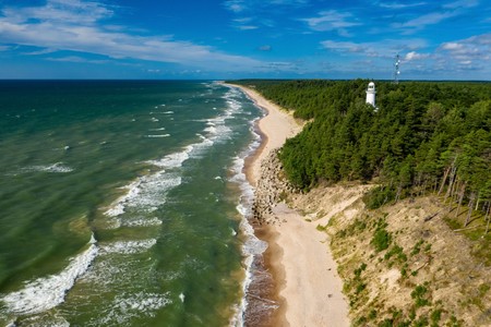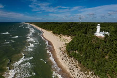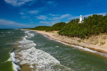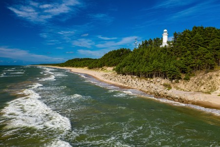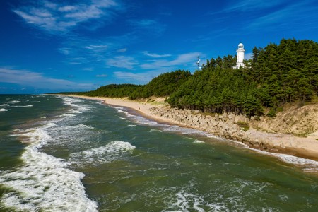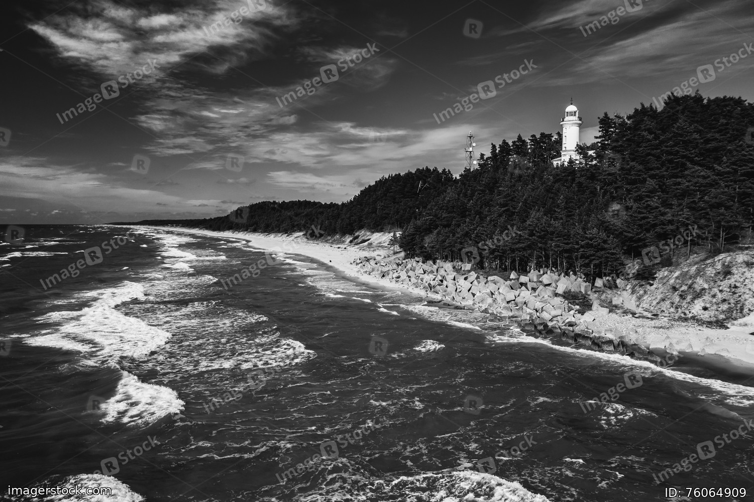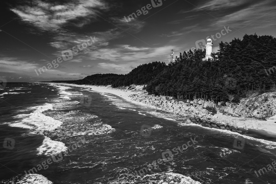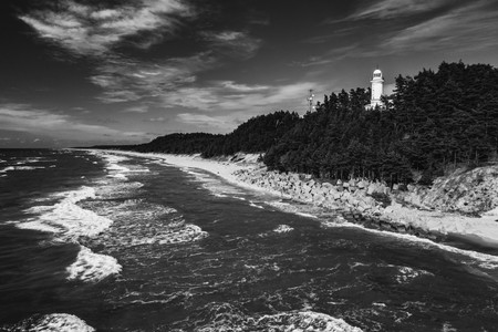 The view of the sea and the Uzhava lighthouse. Black and white.