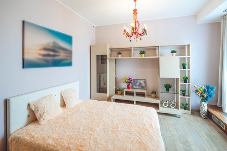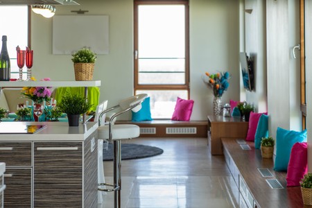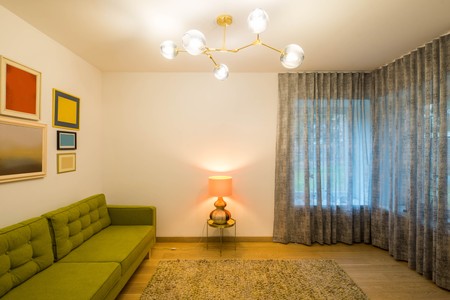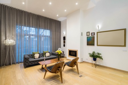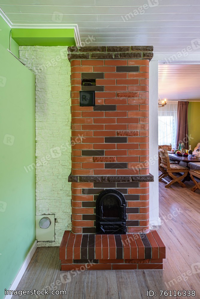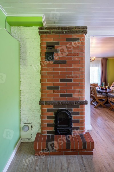 Modern interior of luxury private house. Front view of brick fireplace in the room. Green wall.