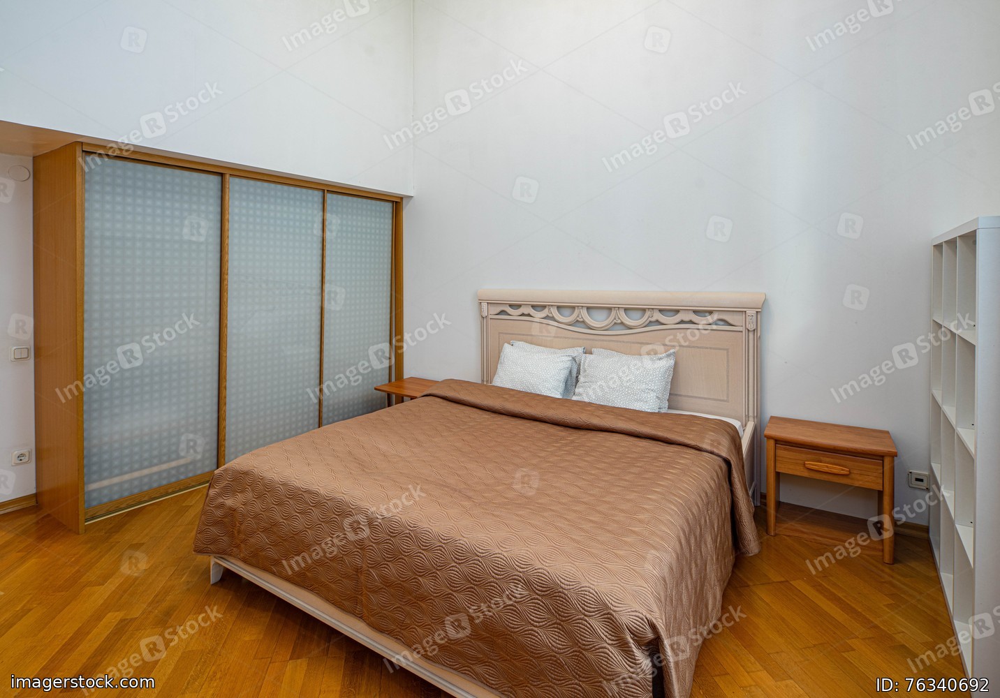 View of bed and wardrobe in bedroom interior. White walls.