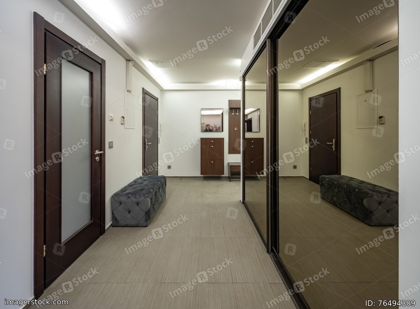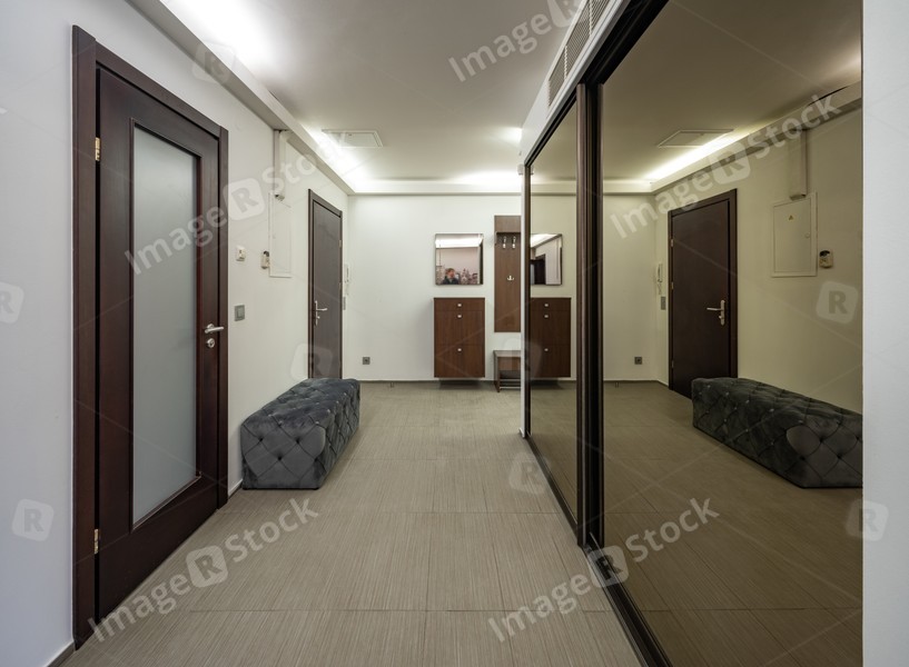 Modern interior of entrance hall in house. Mirror sliding door wardrobe.