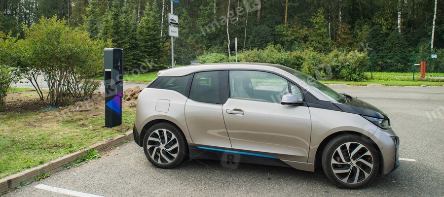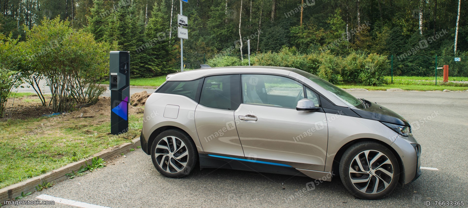 Parking near forest at summer day. Electric car near charging station. Eco-friendly transport.