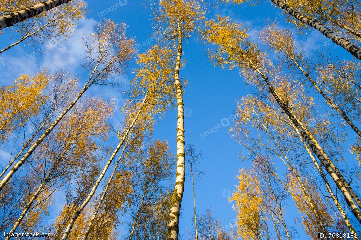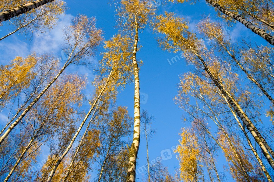 Birches view from below upwards, autumn, yellow leaves.
