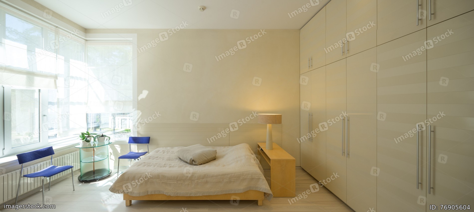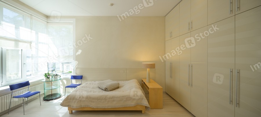 Modern scandic interior of bedroom in luxury apartment.