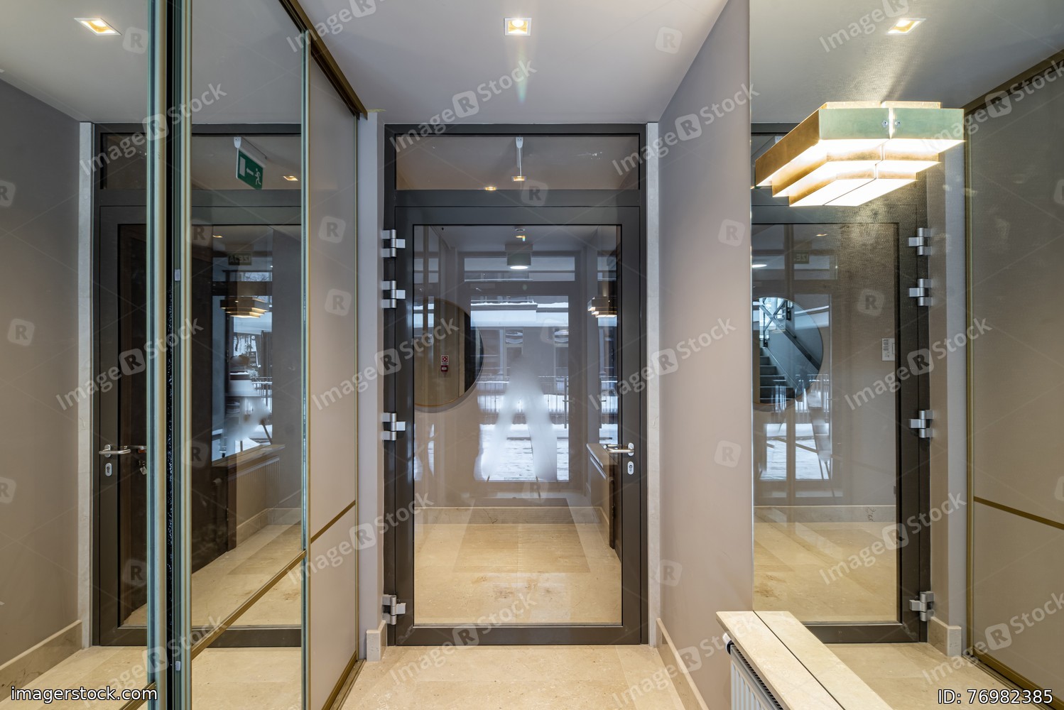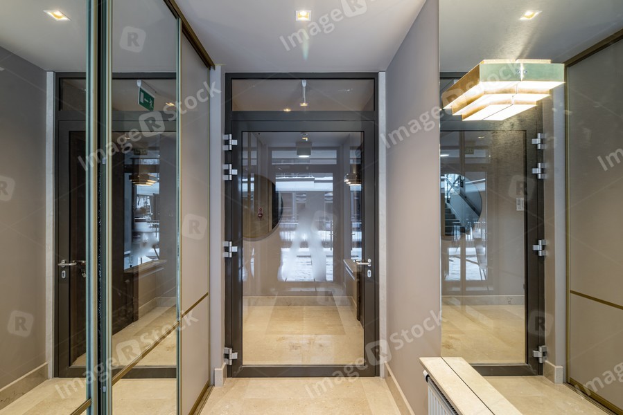 Modern interior of entrance in apartment building. Glass door.