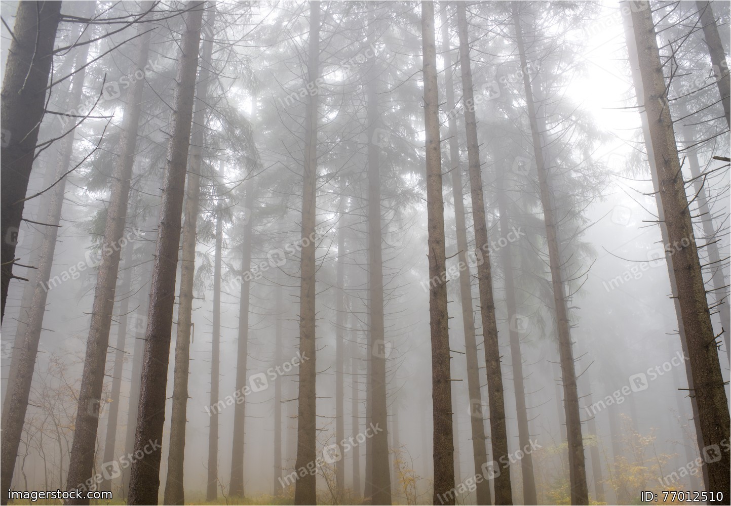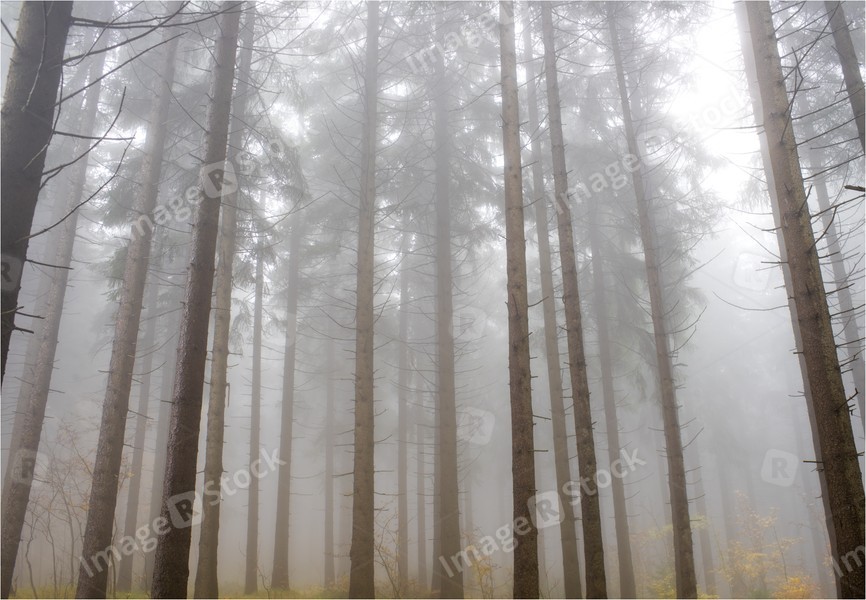 Pine autumn forest in the fog.