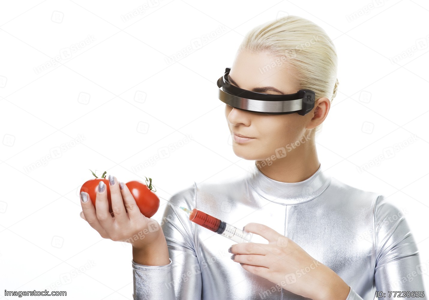 Cyber woman taking vitamins from tomatoes