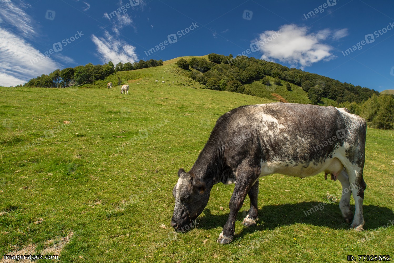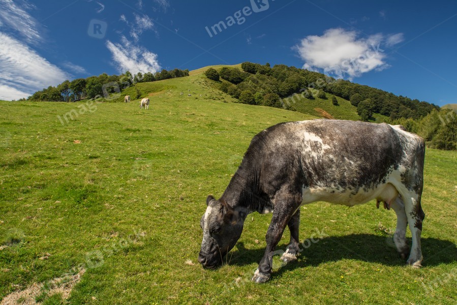 The pasture in the mountains. Cows grazing on the hills. Italy.