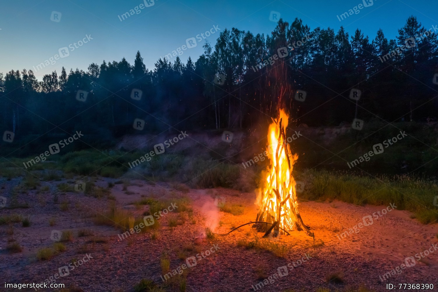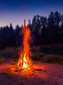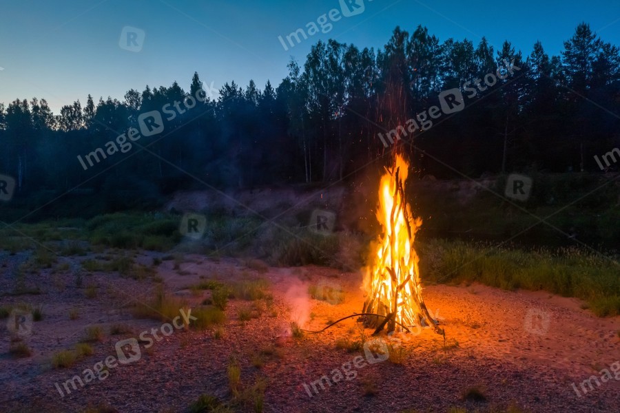 Landscape of forest at white night. Huge fire. Traditional midsummer Ligo celebration.