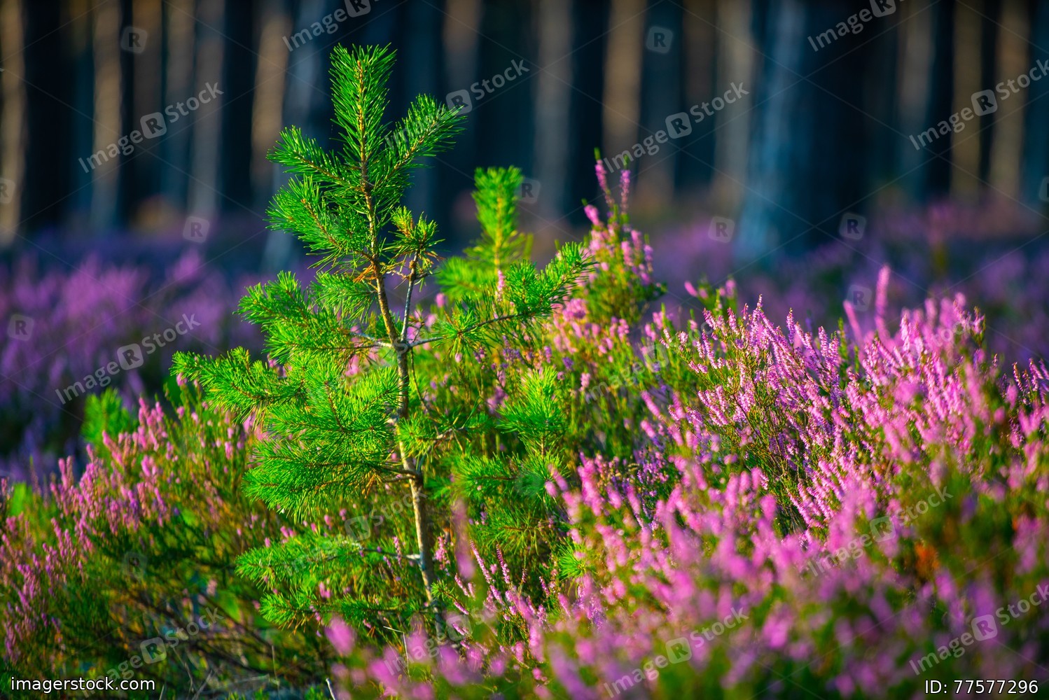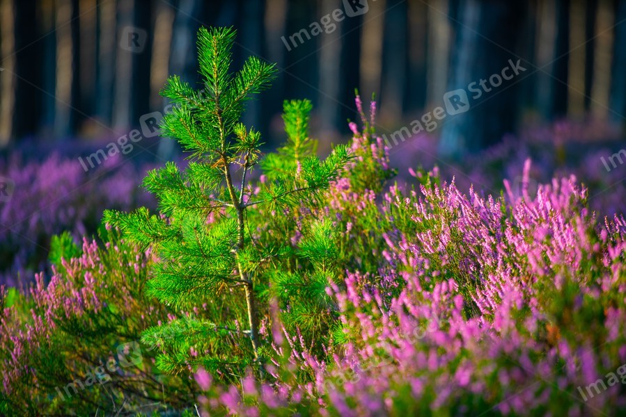 Sunny day. Blooming heather. Beautiful lawn in the forest.