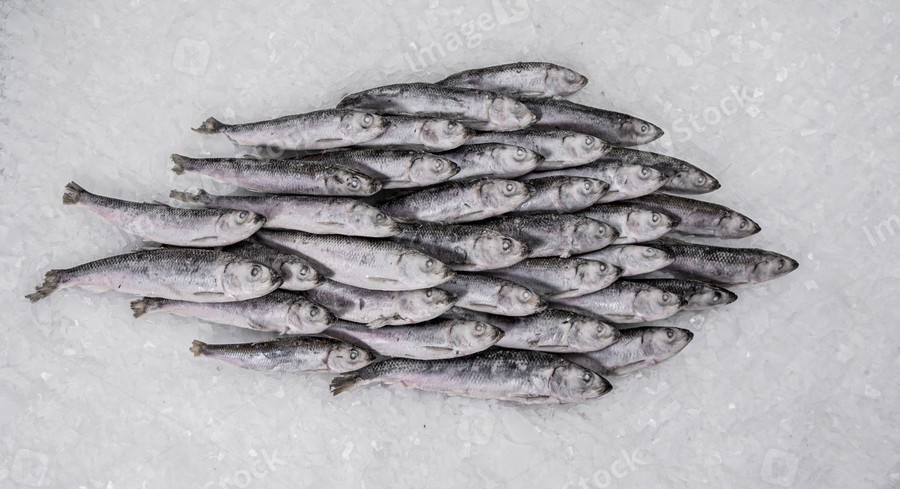 Close-up of fresh sprat on the ice in fish market. Winter fishing. Small silver fish.
