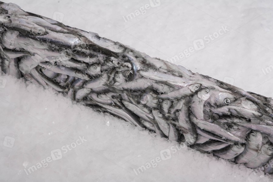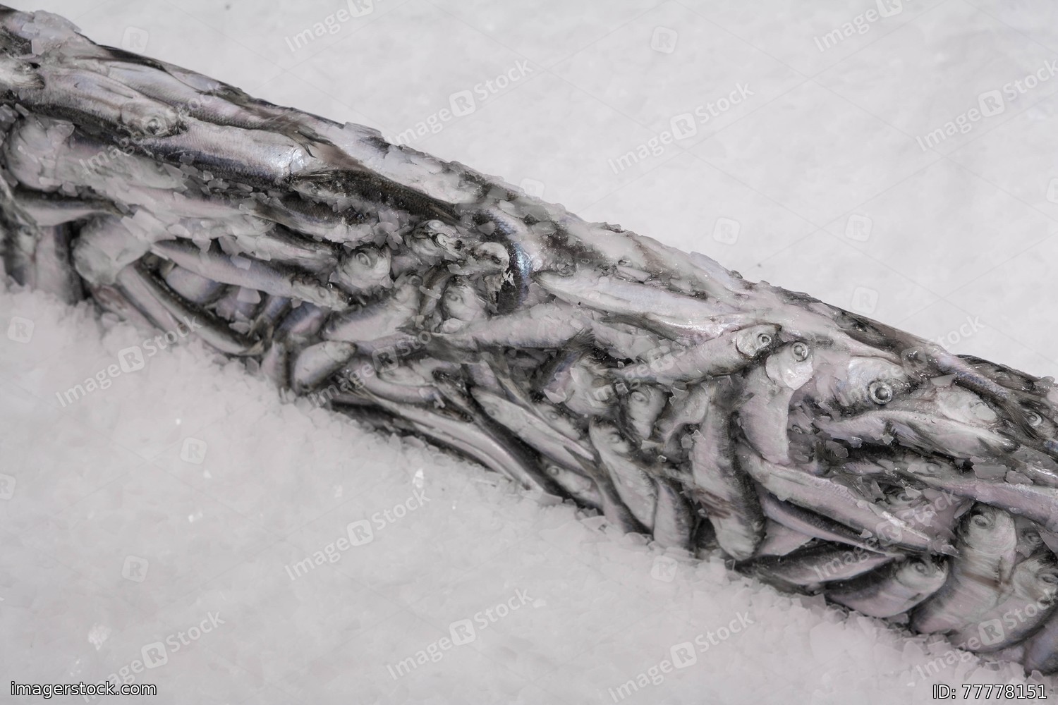 Close-up of sprat brick on the ice in fish market. Winter fishing. Frozen small silver fish production.