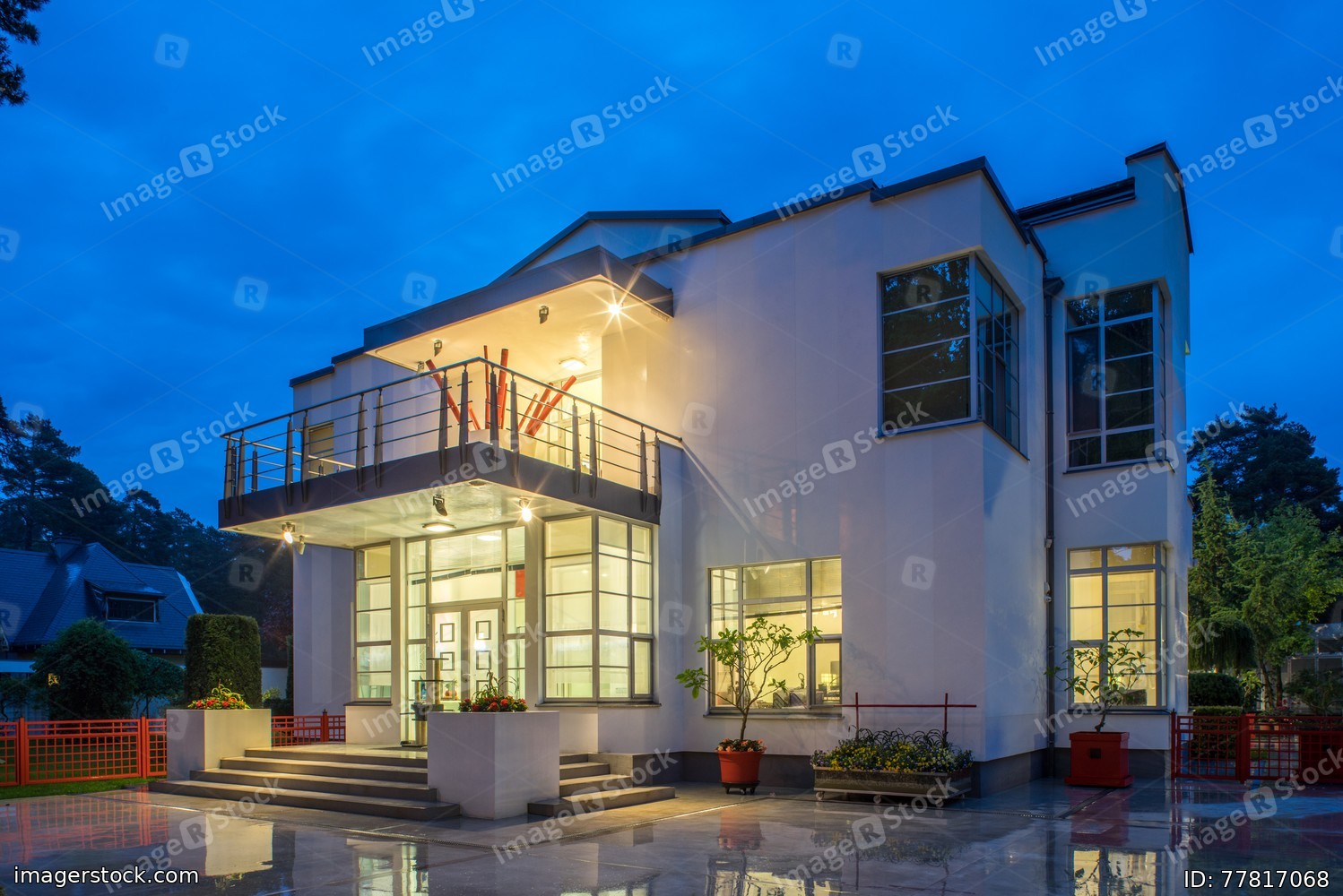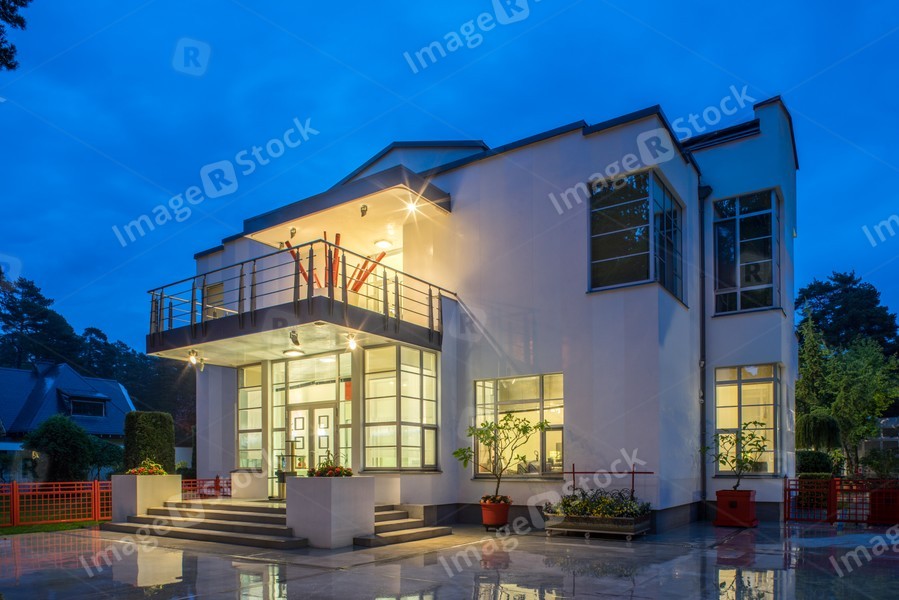 Modern exterior of luxury private house at twilight. View of entrance.