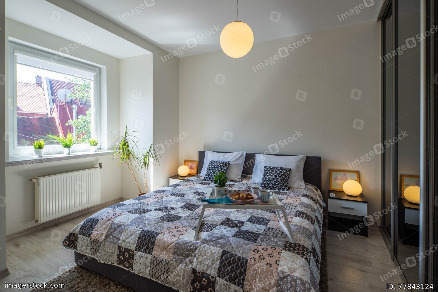 Modern interior of bedroom. Tray with food on the bed. Bedsides with round lamps. Window.