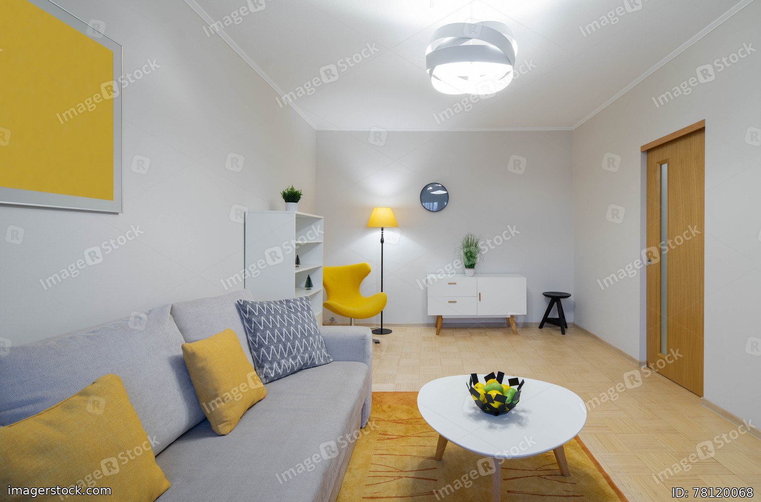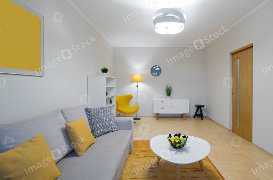 Contemporary interior of living room in modern flat. Cozy furniture. White shelf. Floor lamp. Coffee table.