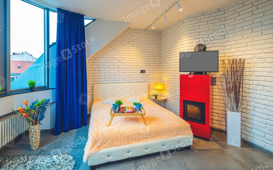 Loft interior of flat. Studio apartment. Panorama windows. Brick wall. Cozy bed with tray. TV on the modern fireplace.