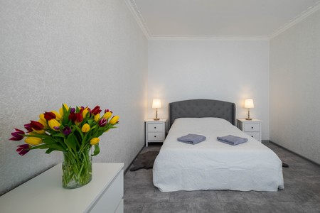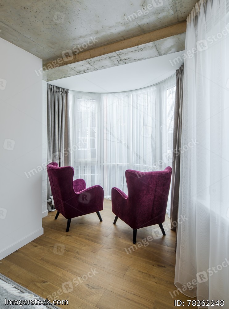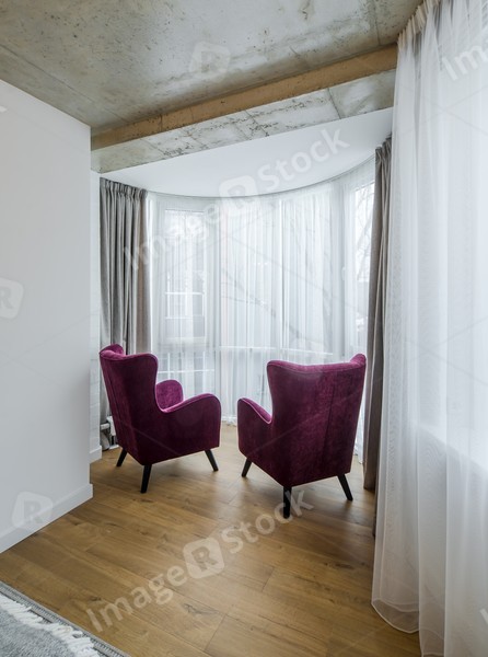 Interior of a modern apartment. Two purple chairs by the window in the bay window.
