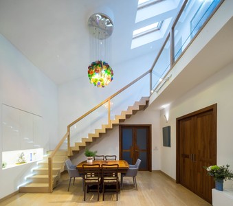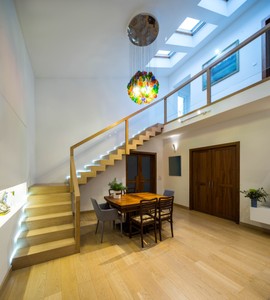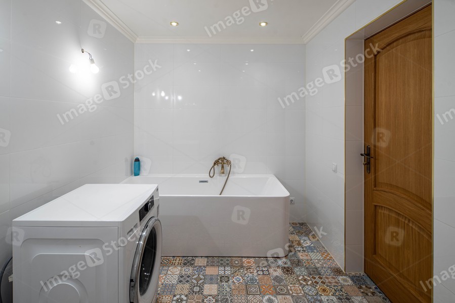 Modern luxury white interior of bathroom in apartment. Huge bath. Washing machine. Private house.