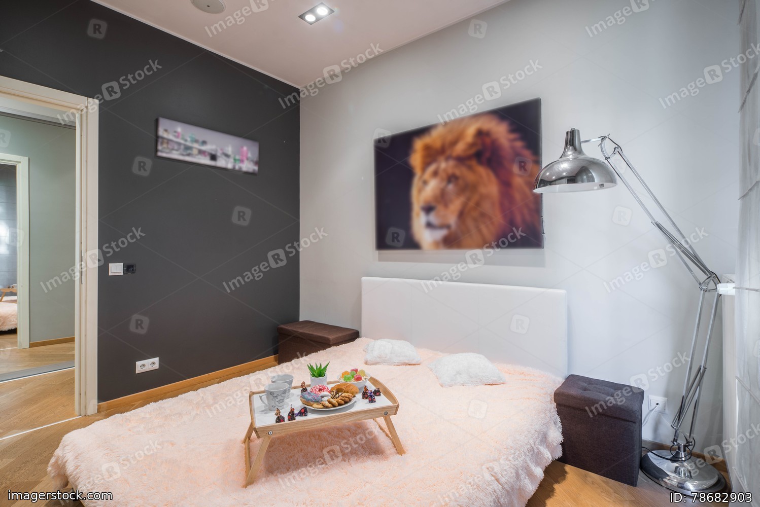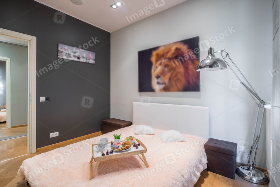 Interior of bedroom in modern flat. King size bed. Food on the tray.