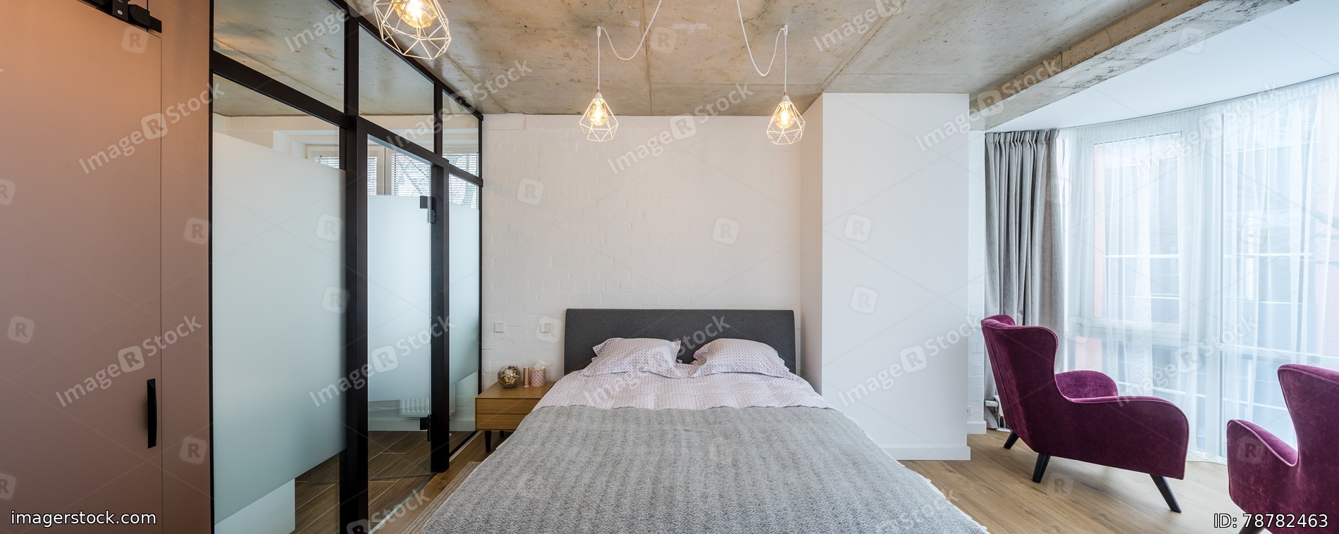 Interior bedroom in the apartment. Concrete ceilings, wooden floor.