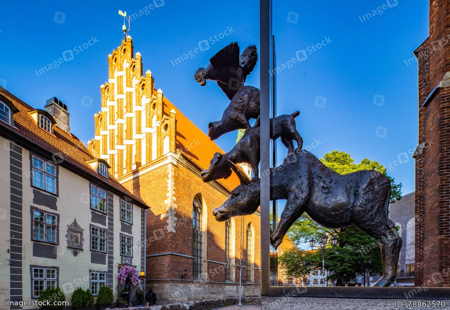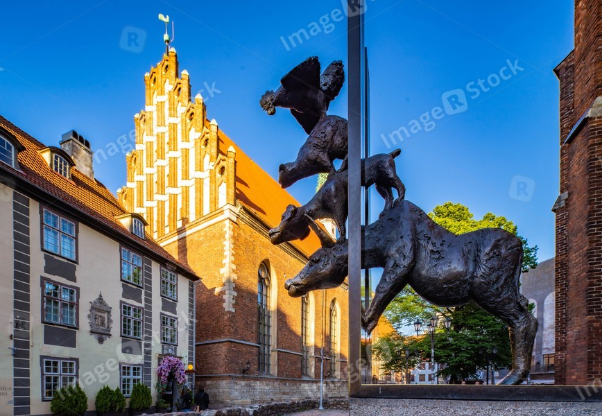 Close-up of monument to Bremen musicians in Riga, Latvia. St. John`s Church. Sunny day.