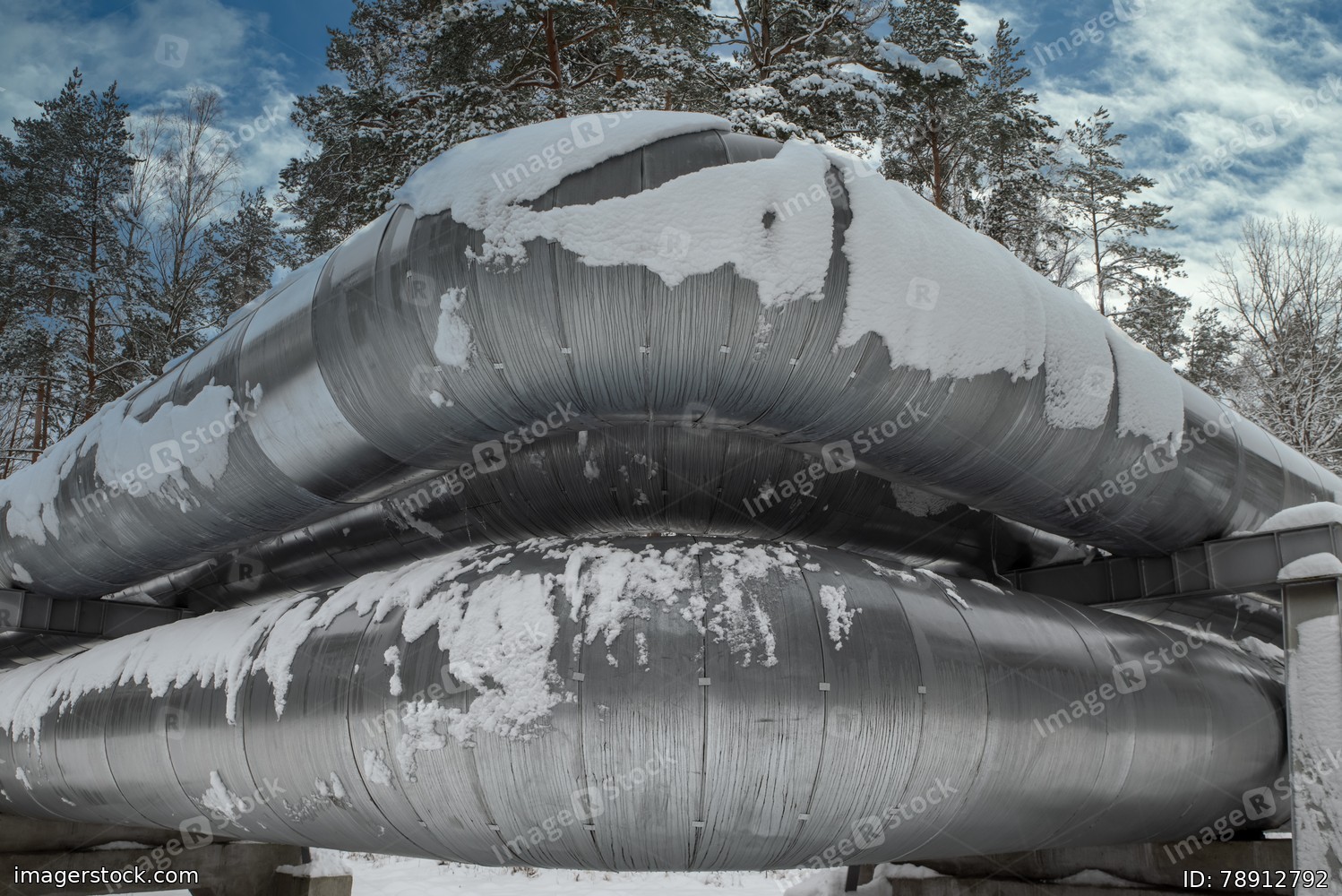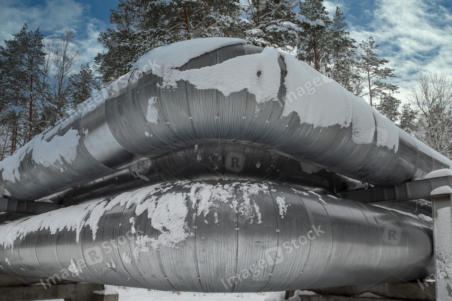 Huge industrial pipelines of central heating system. Snow on pipes.