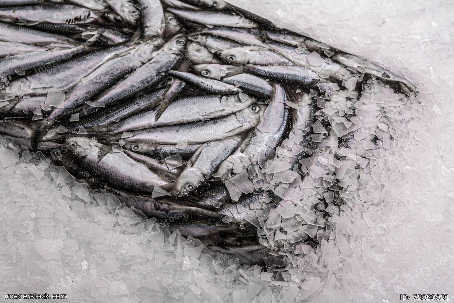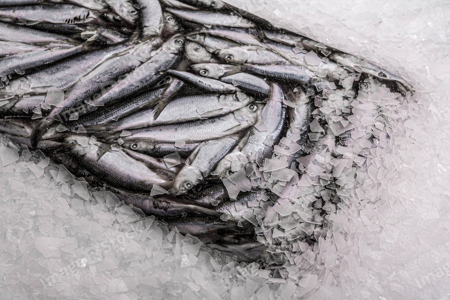 Close-up of sprat brick on the ice in fish market. Winter fishing. Frozen small silver fish.