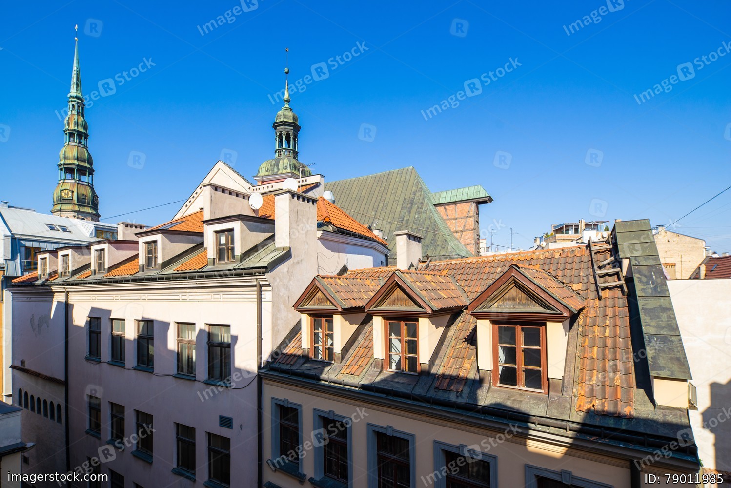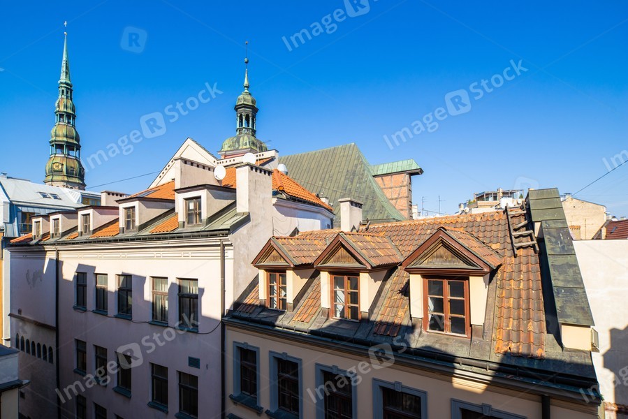 Old town in Riga. Attic windows on the roofs.