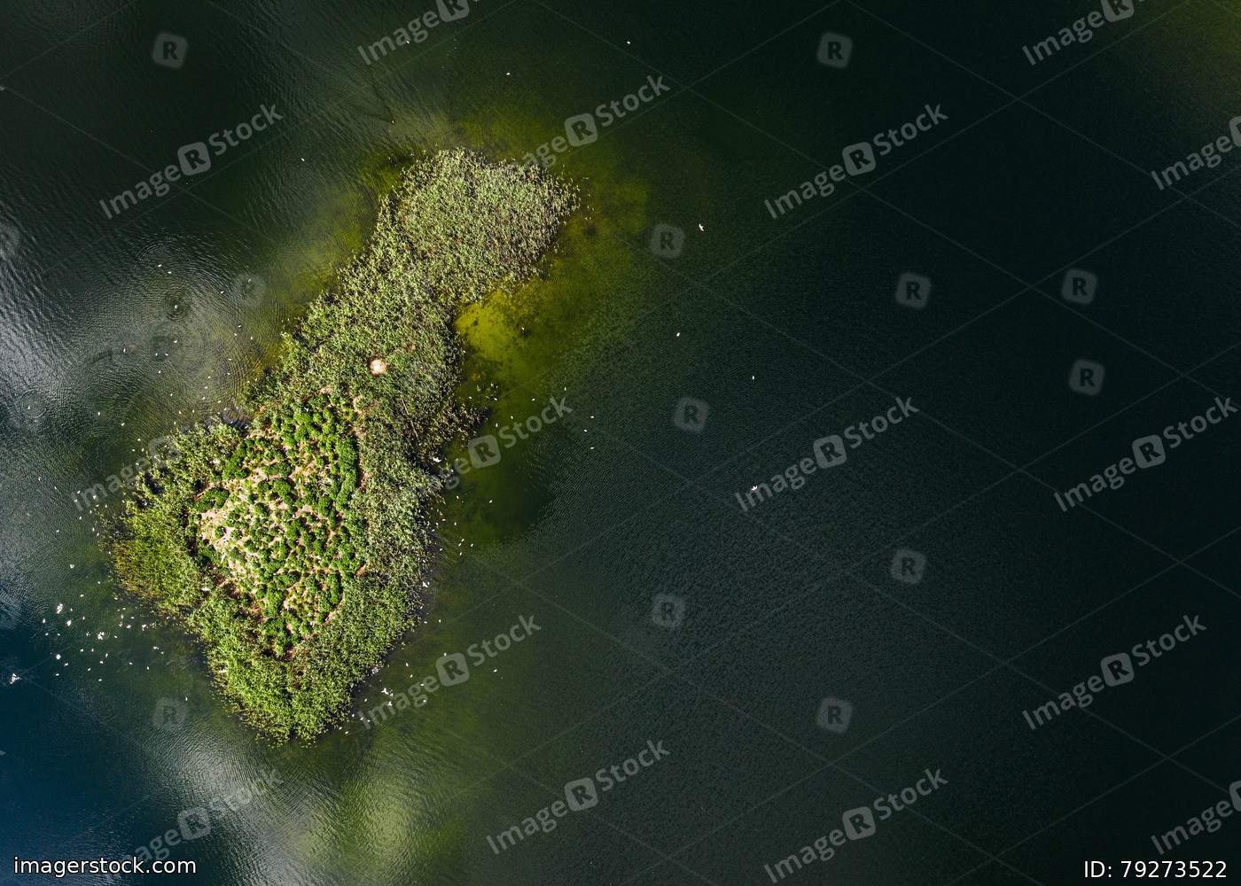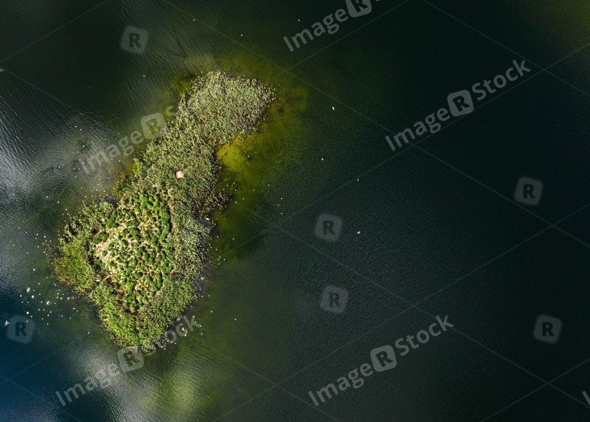 Drone view from above of small grass island in the forest lake. Summer landscape. Scenic landscape.