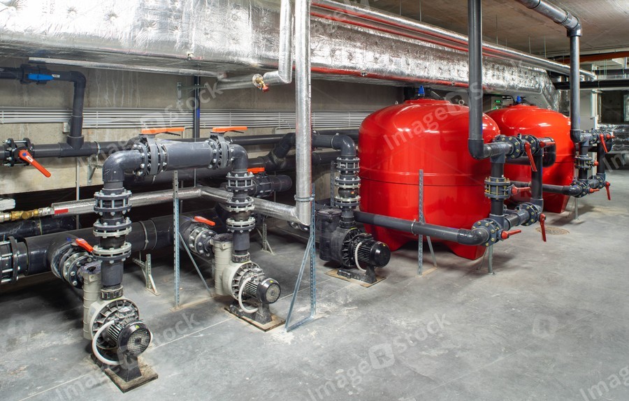 Boiler room. Heating system. Large boiler units. Metal piping system.