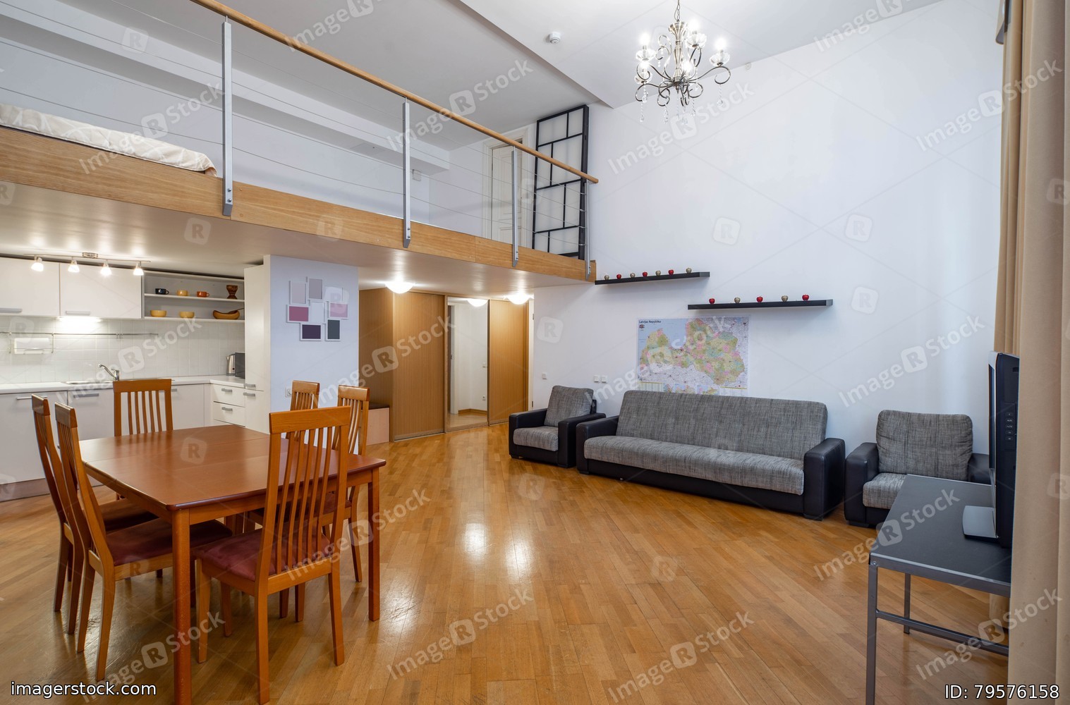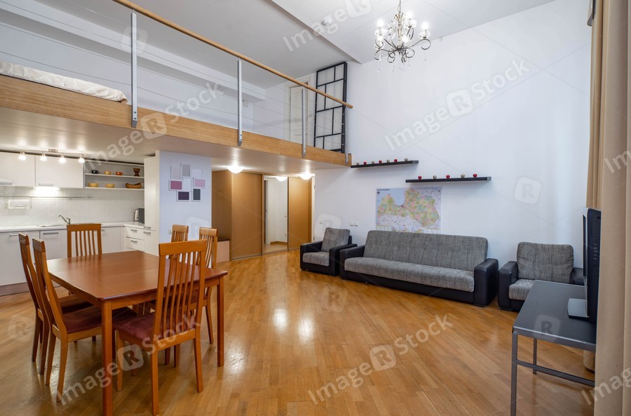 Modern interior of studio apartment. Kitchen set. Wooden table. Cozy couch.
