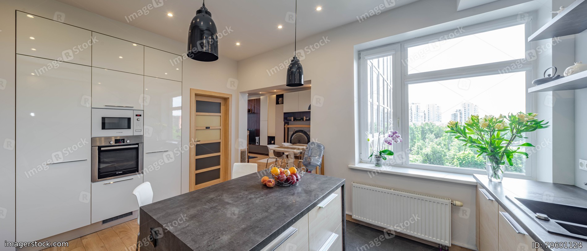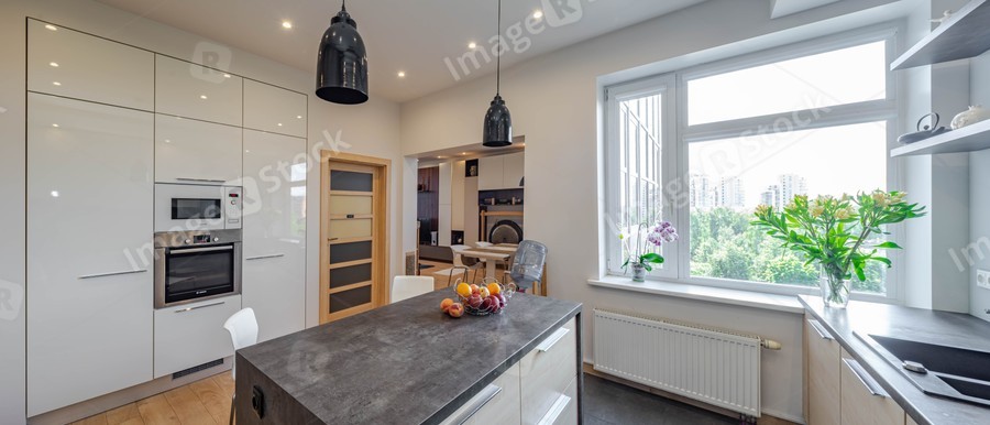 Contemporary interior of kitchen in luxury studio flat. Wooden kitchen table with dark counter. Living room. Built-in kitchen set with oven.