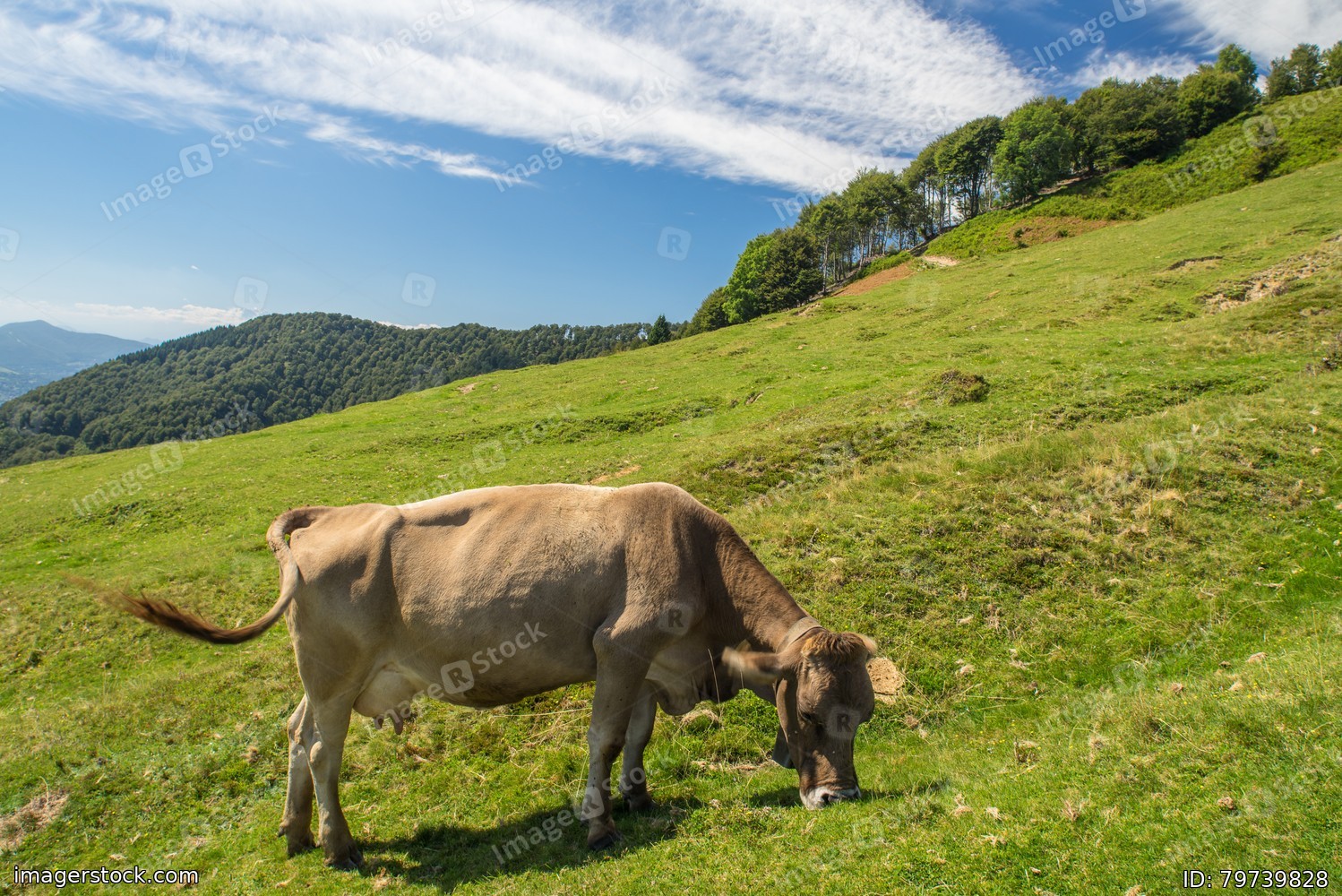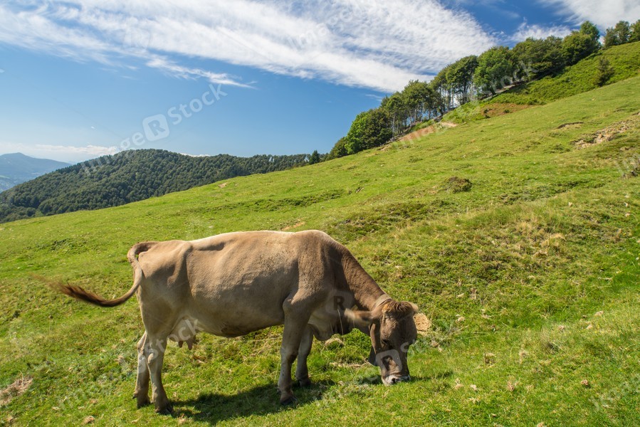 The pasture in the mountains. Cows grazing on the hills. Italy.