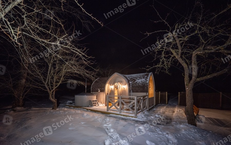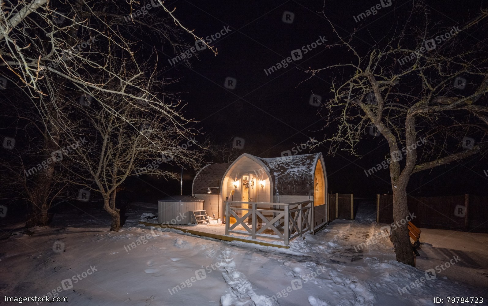 Small wooden illuminated bathhouse at winter night. Finnish sauna.