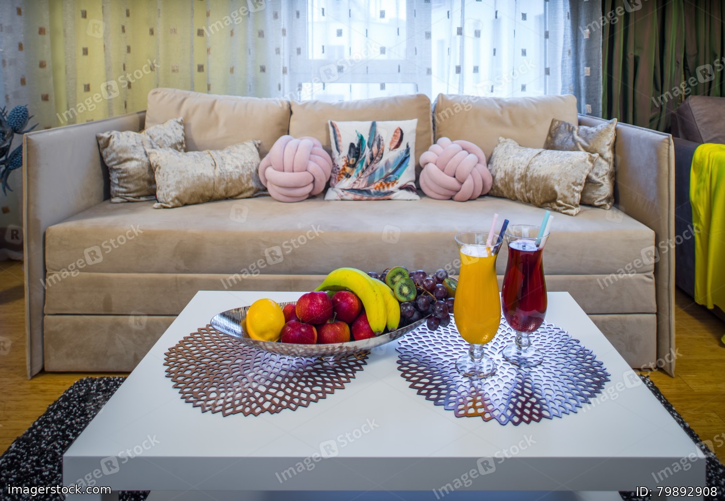 Romantic compositiom with drinks and fruits on the table. Cozy sofa.