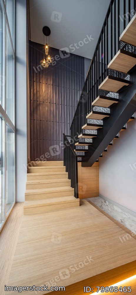 Wooden staircase with illumination in luxury private house. Interior.