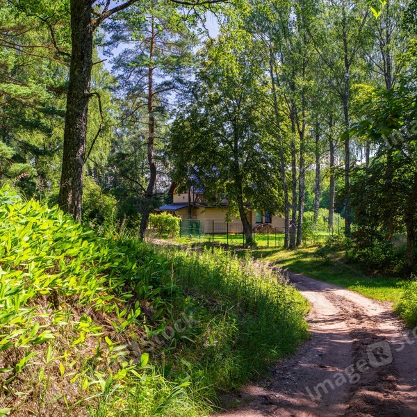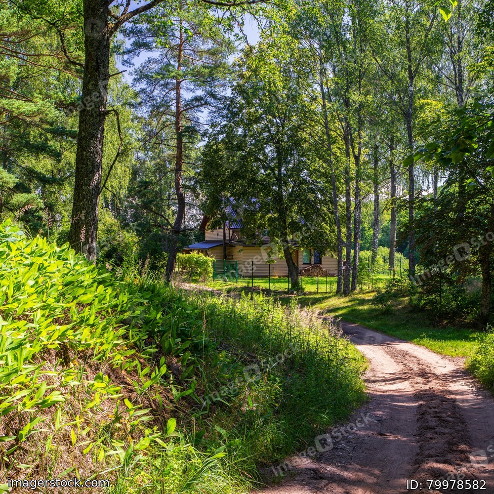 Rural dusty road between green trees to the countryside private house. Modern exterior. Siding wall. Summer landscape.