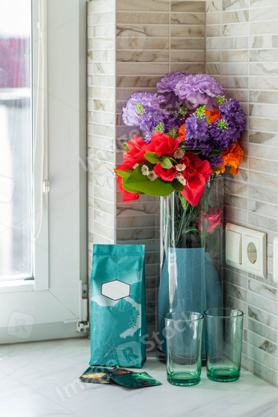 Couple of green glasses. Glass vase with purple, pink and orange flowers.