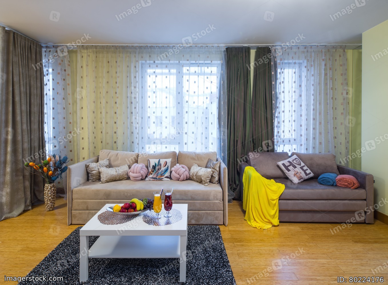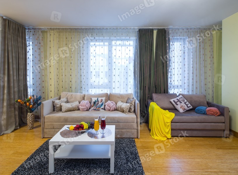 Modern interior of living room. Cozy sofas. Drinks and fruits on the table.