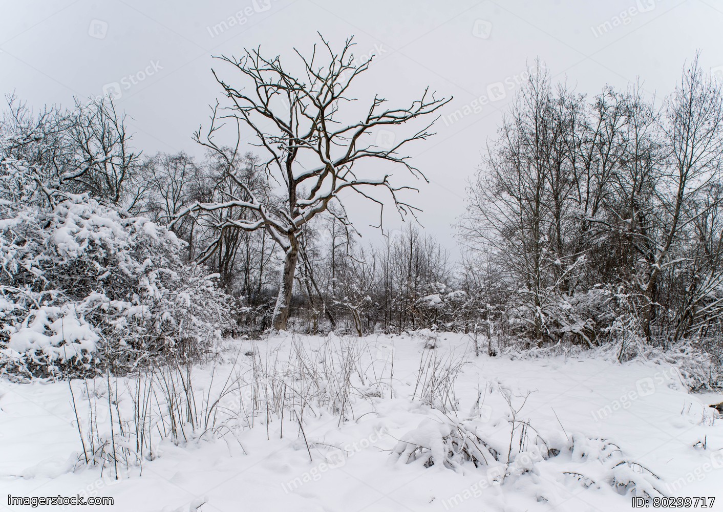 Scenic winter landscape. Beautiful nature. Snow-covered trees in the forest. Cloudy weather.