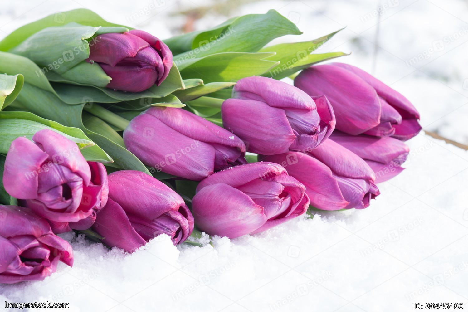 Tulips on the snow in early spring