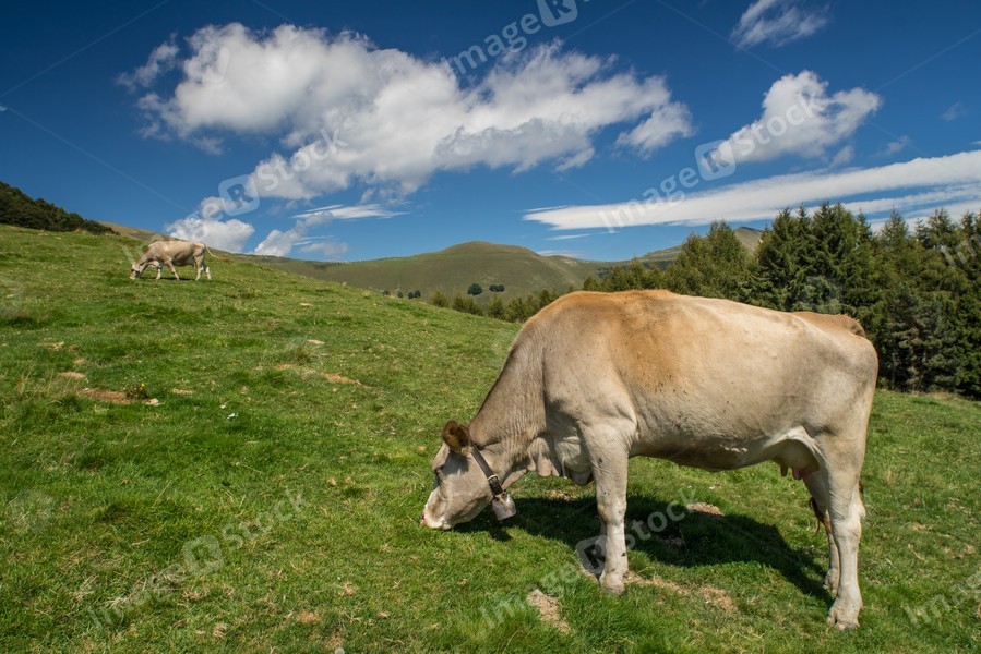 The pasture in the mountains. Cows grazing on the hills. Italy.