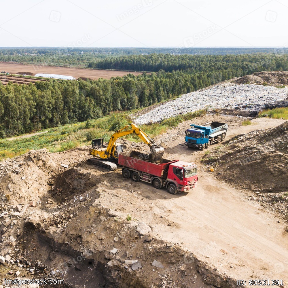 Aerial view of construction works. Earthmoving at open pit mining. Mineral extraction. Excavator and trucks on dirt road.