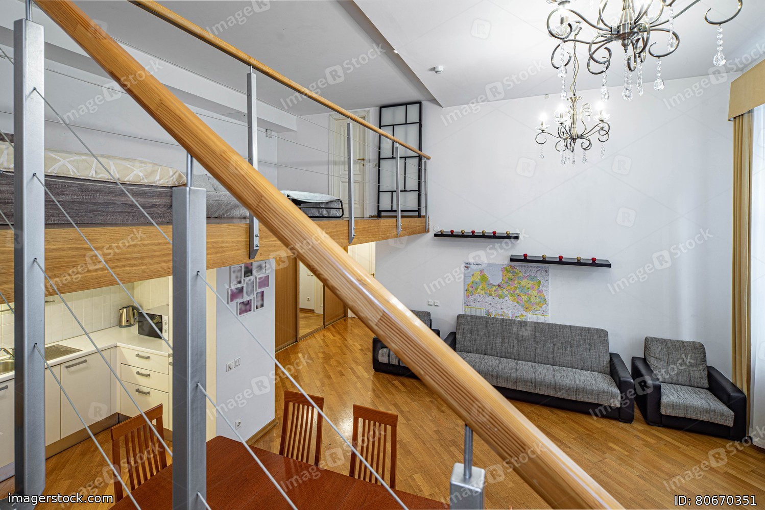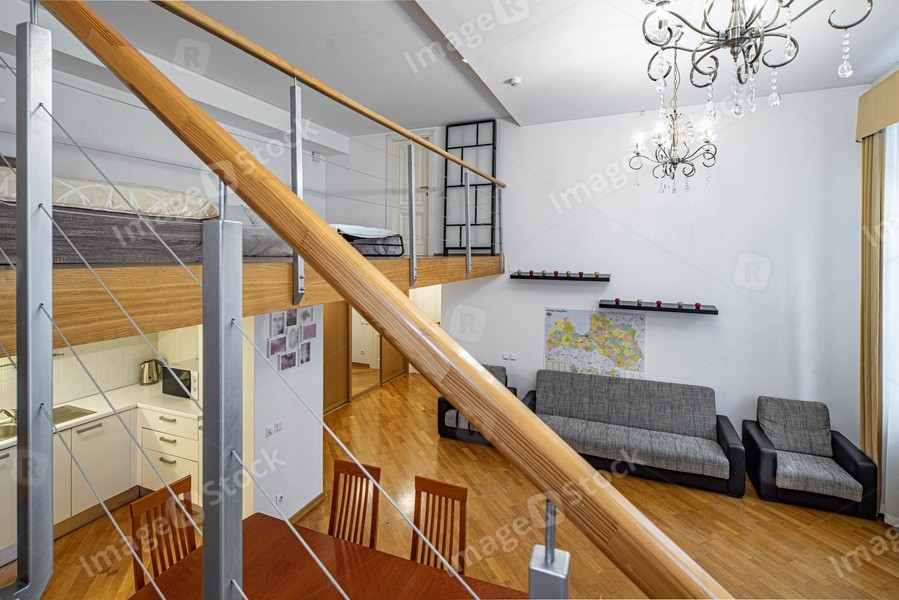 Staircase to the second floor in private house. View of room with furniture.